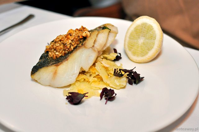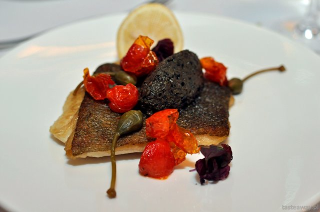 Na dania główne wszyscy zgodnie wybraliśmy ryby i wszystkie smakowały świetnie. Z karty halibut, podawany z tapenadą z czarnych oliwek i pomidorkami koktajlowymi oraz dorsz z migdałami. Osobno dobieramy dodatki (10 zł za dany dodatek): grillowane warzywa, domowe frytki, karmelizowane marchewki, szpinak, puree … Zarówno frytki, jak i grillowane warzywa spisały się świetnie. Zdecydowaliśmy się również na danie spoza karty: piotrosza z puree ze szczypiorkiem oraz jajkami przepiórczymi.