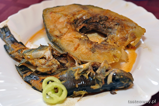 Porcja jest pokaźna, w zasadzie spokojnie starczy na dwie osoby. Osobo podawana jest zupa, osobno ryby. Na pierwszy rzut oka miejscowe halaszle wygląda trochę jak zupa pomidorowa, zwłaszcza, gdy weźmiemy wersję z domowym makaronem. Wystarczy jednak spróbować, by poczuć charakterystyczną ostrość węgierskiej papryki. Jeśli chodzi o ryby, hmmm… wyglądały nie do końca zachęcająco ;)… Co więcej wszyscy przed podaniem narzekaliśmy, że za karpiem nie przepadamy i ewentualnie na Wigilię możemy go zjeść… Jednak, wystarczyło zamoczyć rybę w zupie, by się przekonać, że połączenie jest naprawdę pyszne! Zupa smakowała wybornie!