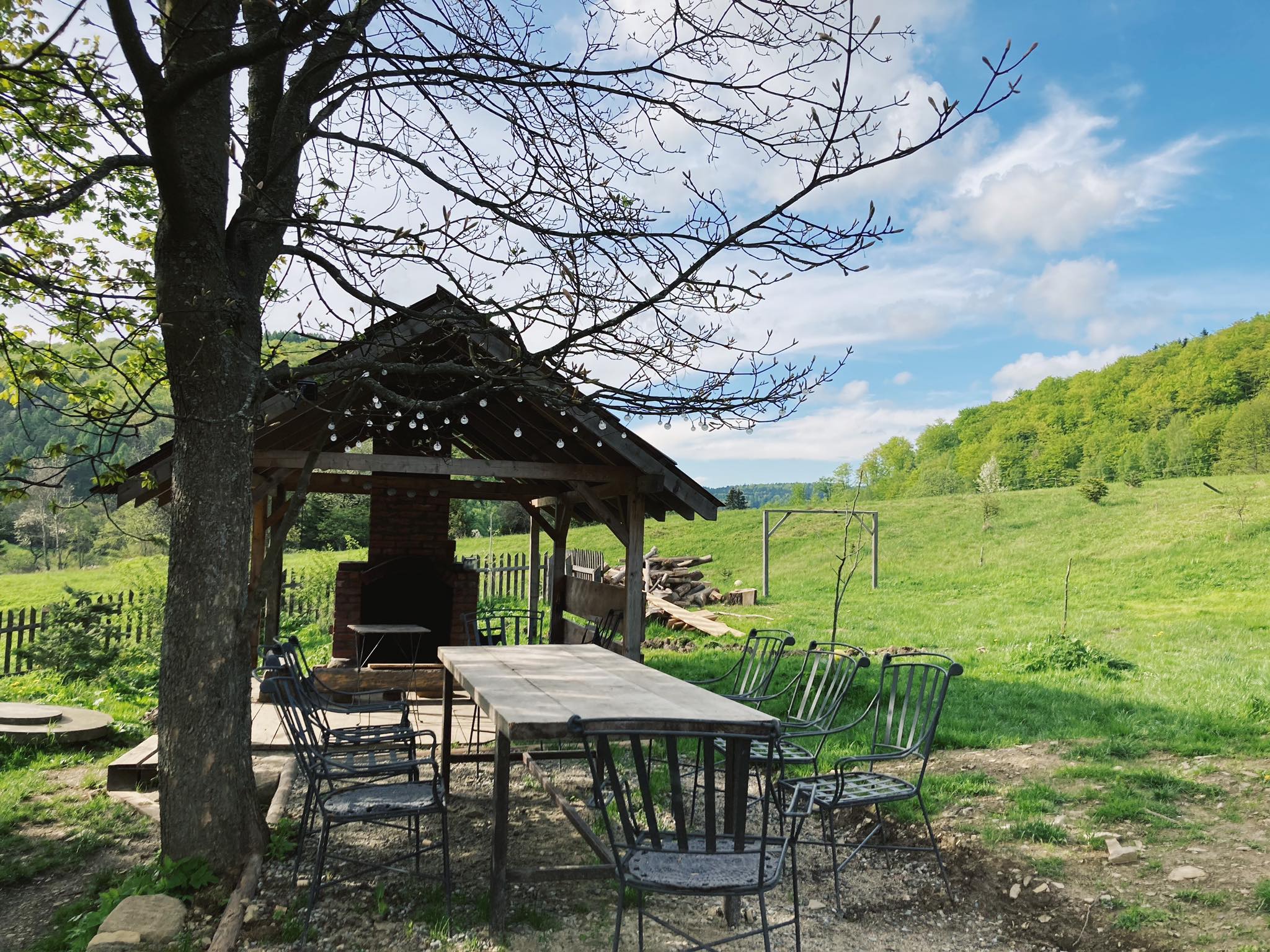 W starym, drewnianym domu z 1939 roku, położnym na wzgórzu z widokiem na góry i cichą dolinę. Dom ten Magda i Maciej uratowali od zniszczenia, przetransportowali z innej części Beskidu i złożyli na nowo, deska po desce. To dom, w którym cudnie skrzypi podłoga, i drzwi. Jest utrzymany w rustykalnym stylu, pełen roślin, ze wspaniałymi grafikami Ryszarda Kai i obrazami od „czary z drewna” na ścianach. W domu znajdują się cztery pokoje gościnne oraz jadalnia i kuchnia. Jestem zachwycona przestrzenią w pokojach oraz miejscami wspólnymi na każdym z pięter, gdzie można się zrelaksować po położeniu dzieci do snu. Każdy obrazek, kwiat, kubeczek, świadczy o staranności, z jaką to miejsce zostało przygotowane dla gości. Dla mnie miejscem, po którym poznaję bratnie dusze, jest też biblioteka, a ta Was tu na pewno nie zawiedzie. Znajdziecie w niej mnóstwo nowości, najlepszy wybór pozycji z literatury dziecięcej oraz podróżniczej.