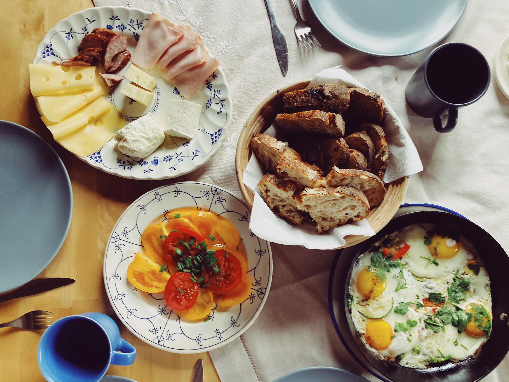 Co pierwsze kojarzy się Wam z domem? Zapach świeżo upieczonego chleba z chrupiącą skórką. Magda piecze chleb, jakiego nie powstydziłyby się najlepsze rzemieślnicze warszawskie piekarnie. Na stole uświadczycie również lokalne jajka, sery, mleko prosto od miejscowych kóz i świeże warzywa. Po południu gospodarze szykują obiadokolacje z deserem. Gotują sezonowo. Jeśli jest maj i sezon na szparagi, próbowaliśmy wspaniałych rolad z indyka zapiekanych ze szparagami w sosie musztardowym. Magda śledzi też kulinarne trendy i podaje np. kluski śląskie w azjatyckim stylu. Desery jedzone przy stole na polu to już sama poezja. Jedliśmy zawsze ciepłe: ciasto z rabarbarem, drożdżówki z kruszonką, które znikały ze stołu rozchwytywane przez małe dziecięce rączki. Jest domowo, lokalnie, sezonowo, po prostu tak, jak na wakacjach być powinno, a zdarza się nie zawsze.