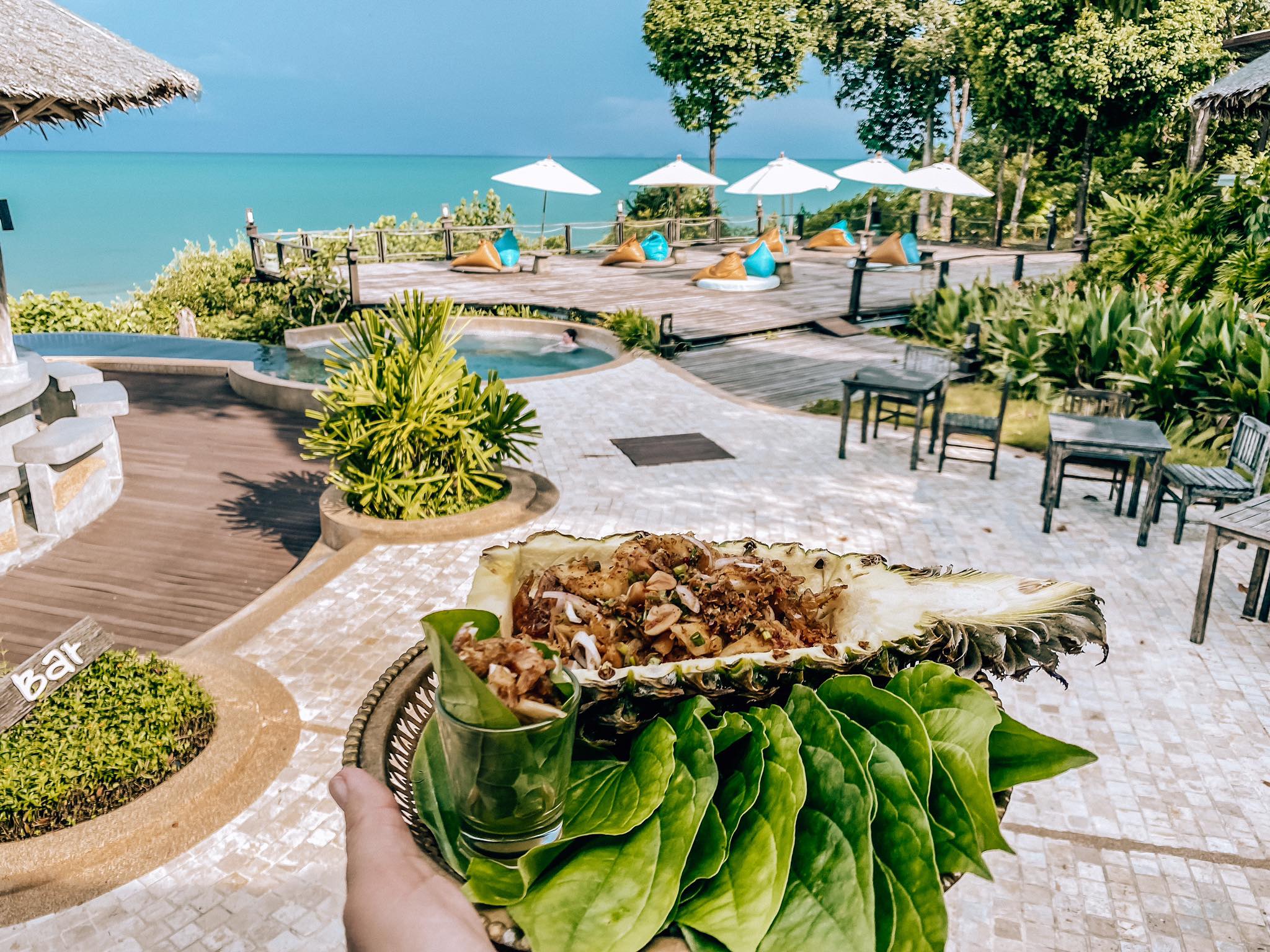 Nas ogromnie fascynował dział sałatki, w którym poza klasycznym som tam, tutaj podawanym z grillowanym kurczakiem, znajdziecie również takie przysmaki jak Yum Som – O, czyli pikantną sałatkę z pomelo z dodatkiem krewetek, Yum Pla Ching Chang, czyli sałatkę z zielonego mango z dodatkiem małych suszonych, chrupiących rybek czy Miang Sapparod – sałatkę z ananasa z dodatkiem orzeszków ziemnych, prażonych wiórek kokosowych i suszonych krewetek. Wszystkich musicie spróbować! 🙂 Sałatka z pomelo idealnie orzeźwia w upalny dzień, a ta z ananasem ma wręcz uzależniający smak! Zarówno pineapple salad, jak i pomelo salad podawane są w owocach, więc tutaj i wygląd, i sposób podania dania, i smak zdecydowanie idą w parze! W przypadku Miang Sapparod dostaniecie też liście bai cha plu (liście dzikiego pieprzu), w które zawijasz sałatkę i jesz wszystko jako niezwykle aromatyczną przekąskę.