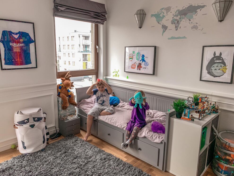 Kluczowe było znalezienie nowego łóżka, które ukoiłoby ból po ukochanym piętrowym! Na poszukiwania ruszyliśmy do IKEI – uznałam, że jeśli potrzebujemy wprowadzić szybkie zmiany, IKEA będzie najlepszym rozwiązaniem. Szukaliśmy łóżka, najlepiej z jakimś schowkiem, bo wcześniejsze łóżko piętrowe było kombajnem z milionem schowków, więc od początku martwiłam się trochę, gdzie teraz wszystko zmieścimy??? Stare łóżko miało w sobie łóżko, biuro, szafki, schowki i szafę, w której Maks trzymał ubrania! Jak to wszystko zastąpić?? W IKEI oglądaliśmy różne łóżka, ale szary HEMNES po prostu nas zachwycił! Co kluczowe – zachwycił również Maksa! Nagle okazało się, że już nie kocha starego łóżka! Już nie może doczekać się nowego! Szare łóżko idealnie pasowało do kolorystyki pokoju – częściowo zastanej jeszcze po poprzednich Właścicielach – to ich sprawką jest piękny szary regał robiony przez stolarza na zamówienie! 🙂 A tu proszę – łóżko idealnie pasujące do tego klimatu! 🙂 Piękne i funkcjonalne – nie dość, że ma 3 pojemne szuflady (dwie na razie służą Maksowi do przechowywania ubrań), to jeszcze można je zmienić w dwuosobowe łóżko, jeśli np. przychodzą koledzy na nocowanie 🙂 My na razie zakupiliśmy tylko 1 materac dla Maksa, bo covid coś nocowankom nie służy, ale wystarczy dokupić materac i z Hemnesa robimy łóżko dla dwójki 🙂 Podsyłam link, jak to wygląda 🙂