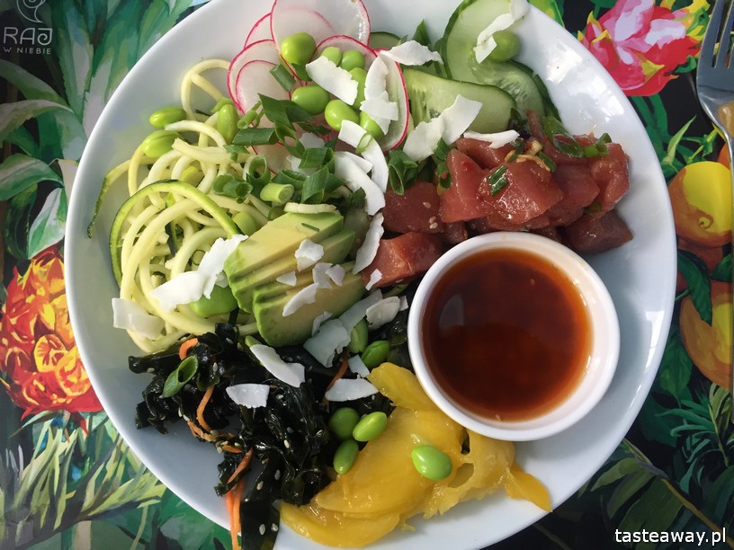Z naszej czwórki wyłamuje się tylko Łukasz i zamawia. My bierzemy poke bowle z łososiem i tuńczykiem. Tuńczyk zdecydowanie wygrywa aż zapominam o zdjęciu tego z łososiem! Wybaczcie! Łukasz wybiera Loco Moco – wołowina grillowana w formie burgera serwowana z jajkiem sadzonym, ryżem oraz sosem na bazie mieso i grzybów shitake (29,80 zł – foto powyżej). Wizualnie nie zachęca za bardzo, smakowo raczej nijakie – na to danie raczej byśmy tu nie wrócili. Co innego – bowle! Widziałam je już na zdjęciach, ale dopiero teraz doczytałam, że bowle z surową rybą, warzywami i gorącym ryżem to tradycyjne danie na Hawajach. Wyglądają mega apetycznie! Trzeba sprawdzić czy tak też smakują! Ahi Poke Bowl to miska z tatarem z tuńczyka, świeżymi warzywami, owocami i ziołami (mango, awokado, kokos, ogórek, cukinia, rzodkiewka, sałatka z glonów wakame). Podawana z ciepłym ryżem i sosem sezamowym (29,80 zł). Salmon Poke Bowl ma tatara z łososia, a do tego cukinię, marchew, ogórka, melona, marynowany imbir, rzodkiewkę, grzyby mun, kokosa, również z ryżem i tym razem z sosem owocowo-imbirowym (29,90 zł). Jest też bowl z tofu, z satayami z kurczaka, z omletem czy z krewetkami. Te rybne (z łososiem czy z tuńczykiem) wypadają świetnie i zwłaszcza miska z tuńczykiem sprawia, że chyba całkiem szybko wrócę do Raju!