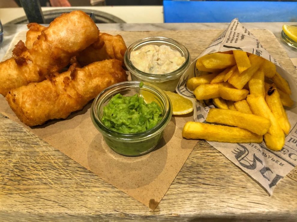 Spróbowaliśmy dwie rzeczy – fish & chips oraz ostrygi. Fish & chips (39 zł) okazał się strzałem w dziesiątkę! Jeśli dłuuuugo nas czytacie, być może wiecie, jak bardzo zakochaliśmy się kiedyś w irlandzkim Howth, gdzie fish & chips można zjeść w świetnym wydaniu na każdym kroku – zarówno w barze na wynos, jak i w dobrych restauracjach (zajrzyjcie TU – sami zobaczycie, że to miejsce idealne dla fanów ryb i owoców morza).